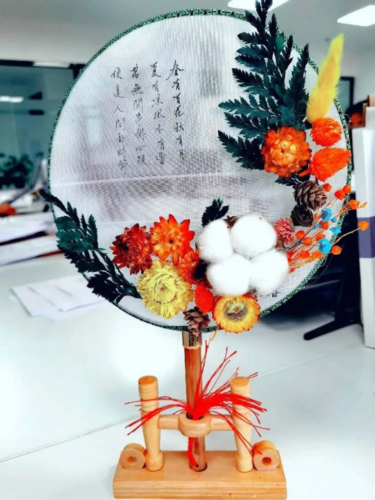 手中白團扇。凈如秋團月。永生花落座于團扇,美在其形,美在其韻,希望“女神”們能與這幅團扇一樣美在其心,美在其魂。
